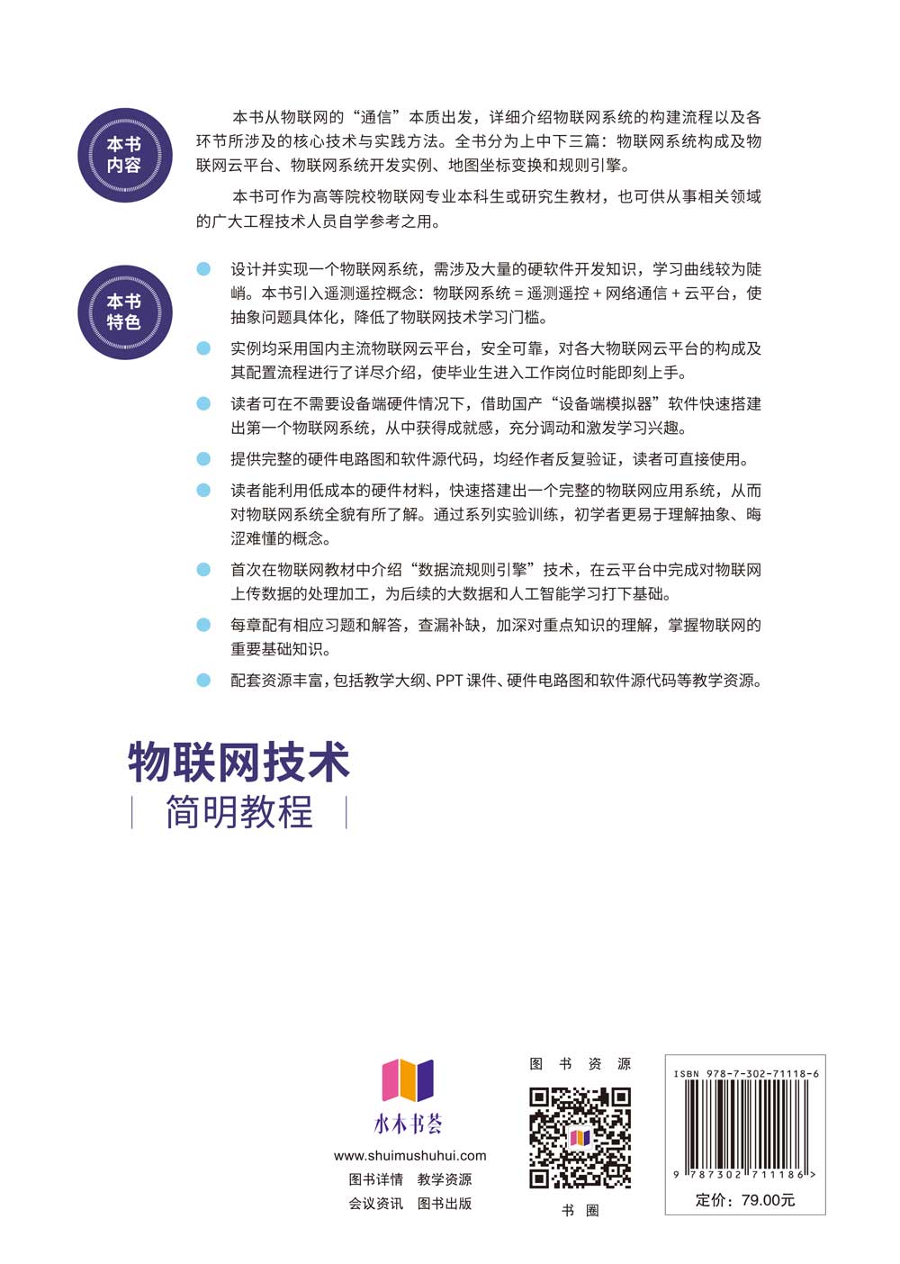 "本书内容涵盖物联网系统“端管云用”全栈开发的关键技术及实现方案,分为三篇,共10章。上篇为基础篇,对体系结构、常用云平台、通信协议、通信报文、物模型等概念进行阐述,给出利用设备端模拟器快速搭建物联网系统的具体方法。中篇为应用篇,对开源板卡、传感器、通信模块、开发软件进行较为详细的解析,给出一系列详尽的物联网系统实现方法和实验代码。下篇为提高篇,介绍 GPS/BD 定位技术和规则引擎技术在物联网的具体应用。 本书特点是基于遥测遥控视角,利用低代码技术,将物联网技术学习简单化,让学生在课堂或寝室能利用低成本的硬件材料,快速搭建出一个完整的物联网应用系统。通过书中提供的系列实验训练,初学者更易于理解本学科那些抽象、晦涩难懂的概念,从而达到降低学习曲线陡度、增强学习兴趣之目的。书中提供的硬件电路和软件代码已经作者验证,在教学中可直接使用。 本书适合作为物联网相关专业的教材,也可供工程技术人员参考。"