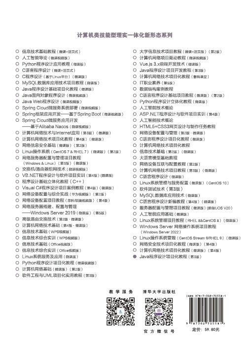 前言 1. 编写背景 在深入贯彻党的二十大精神,加快建设教育强国、科技强国、人才强国的时代号角下,在产业数字化和人工智能赋能千行百业的时代背景下,学好 Java 编程不仅是掌握一门核心开发技术,更是借助 AI 辅助编程工具实现高效开发、引领智能时代技术创新的重要起点。 《Java程序设计项目化教程(第2版)》自出版以来,已重印多次,得益于全新的编写思路和鲜明的应用型特色,深受广泛读者的欢迎。鉴于Java技术的不断发展及教育需求的变化,我们突破原有内容结构新编教材,以确保本书更好地服务于学习者。 本书将原有一个项目贯穿整本书的结构改为28个阶段性项目和1个综合项目,使学习过程更加灵活多样。同时,我们新增了关于Lambda表达式的内容,深入解析Java 8中引入的函数式编程概念,显著提升编程效率。此外,本书的开发平台已升级为IntelliJ IDEA,以提供更强大的开发工具支持;JDK版本也同步更新至JDK 24,涵盖最新特性和改进。为了更好地支持学习体验,我们增加了视频、习题、配套PPT和项目分析等数字资源,确保纸质教材每三年进行一次更新,同时实现数字资源的随时增减和修订,进一步提升学习效果。 与此同时,新增的AI辅助编程内容帮助学生利用智能技术提高编程效率,激发创新意识。通过新编上述内容,我们希望读者能够更加深入地理解Java语言的应用,并掌握现代软件开发所需的基本技能。 2. 本书特点 (1) 知识体系阶梯化,从基础到实战闭环贯通 本书遵循“语法筑基→面向对象深化→高级特性拓展→综合项目落地”的递进逻辑,既拆解 Java 基础语法、类与对象等核心知识,又通...