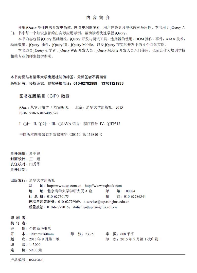 使用 jQuery能使网页开发更高效,网页更绚丽多彩,用户体验更具现代感和易用性。本书用于 jQuery入门,书中每一个知识点都给出实际应用示例,帮助读者快速掌握 jQuery。本书内容包括 jQuery基础语法,jQuery开发与调试工具,选择器的使用, DOM操作,事件, AJAX技术,动画效果,jQuery 插件,jQuery UI,jQuery Mobile,以及 jQuery在实际开发中的 4个具体实例。本书适合 jQuery初学者、jQuery Web开发人员、jQuery Mobile开发人员入门使用,也适合作为培训学校相关专业的师生教学参考。