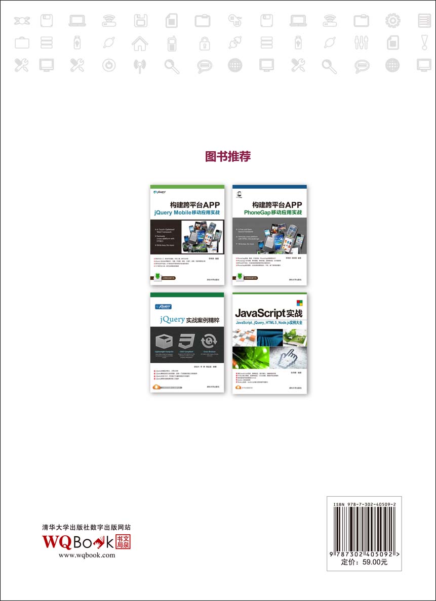 jQuery是常用的 JavaScript方法的一堆封装,它在一定程度上加快了前端开发的速度,同时会缩短项目的开发周期,而且会减少项目中的冗余代码。使用 jQuery最大的优点是,jQuery开源而且跨平台,它兼容 CSS3,还兼容各种浏览器,如 IE 6.0+、FF 1.5+、Safari 2.0+、Opera 9.0+等。 本书的目的是带领读者打开jQuery的学习之门,读者不仅仅可以了解 jQuery的语法,还可以熟悉jQuery在现实网页开发中的应用方法和技巧。 本书特点 本书力求让读者没有任何难度地学习jQuery,写作时利用以下特点降低难度: .一个语法一个应用示例:每个语法都配备一个动手示例,读者看完语法后,通过动手实验来融会贯通。 .一个技术一个大型项目:不管是 jQuery UI,还是 jQuery Mobile,本书都给出了一个大型项目供读者在实际开发中了解框架的使用。 .完善的代码、技巧和说明:每一个难点本书都给出了比较完整的说明和技巧演示,让读者在学习的时候还能举一反三,加深印象。 本书内容 本书提供了完整的jQuery学习路线,全书内容包括:jQuery环境搭建,jQuery选择器,jQuery操作DOM,jQuery的事件与事件对象,jQuery与AJAX的交互,jQuery动画效果,jQuery插件, jQuery的UI插件,常用的 jQuery插件, jQuery Mobile移动开发, QQ邮箱附件的拖放上传实例,jQuery Mobile开发一个手机博客实例,在线播放器实例, 股票实时走势图实例。 本书读者和作者 本书是一本...