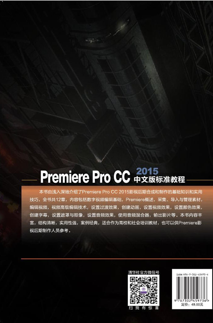 本书由浅入深地介绍了使用Premiere Pro CC 2015影视后期合成和制作的基础知识和实用技巧,全书共12章,包括数字视频编辑基础、Premiere Pro CC概述、采集、导入与管理素材、编辑视频、视频高级编辑技术、设置过渡效果、创建动画、设置视频效果、设置颜色效果、创建字幕、设置遮罩与抠像、设置音频效果、使用音频混合器、输出影片等内容。 全书图文并茂,将枯燥乏味的基础知识与案例融合,秉承了基础知识与实例相结合的特点,内容丰富、结构清晰、实用性强、案例经典,配书光盘提供了语音视频教程和素材资源。本书适合Premiere Pro CC初学者、影视后期制作人员、大中院校师生及计算机培训人员使用,同时也是Premiere Pro CC爱好者的必备参考书。