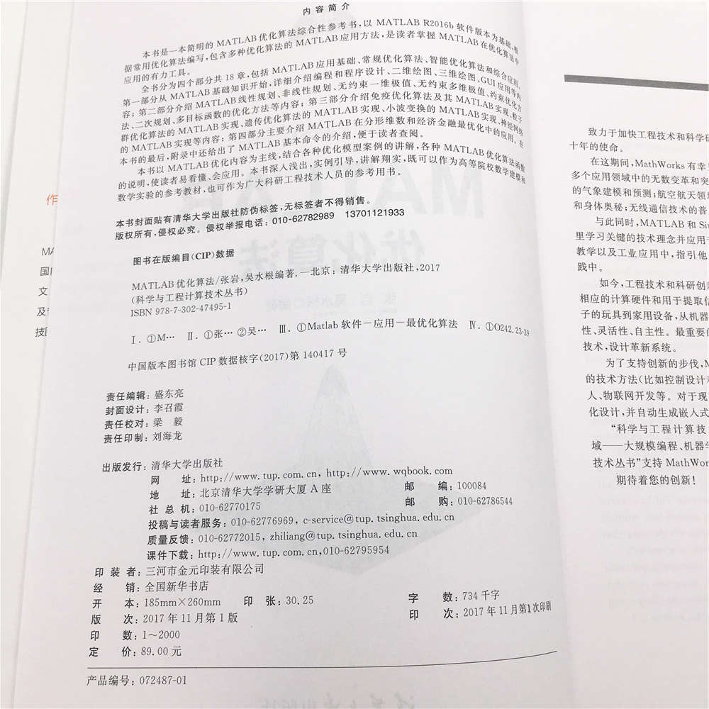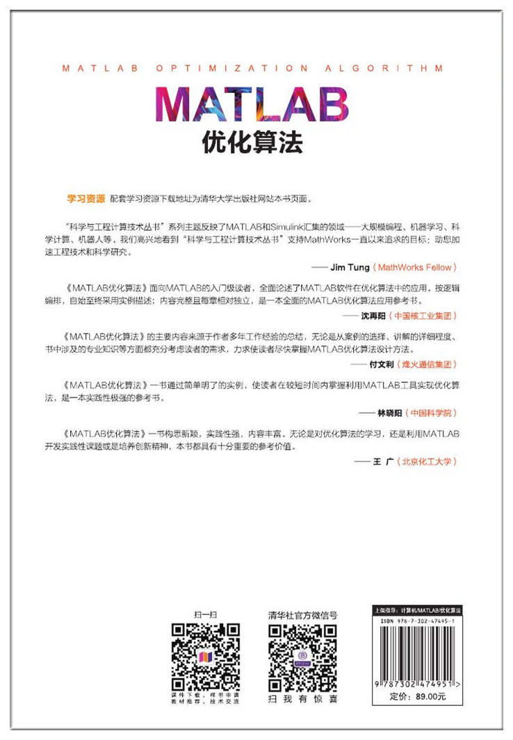 前言 MATLAB是美国MathWorks公司出品的商业数学软件,常用于算法开发、数据可视化、数据分析以及数值计算的高级技术计算语言和交互式环境。在优化算法中,MATLAB也有大量的应用。 优化算法有很多,关键是针对不同的优化问题,如可行解变量的取值(连续还是离散)、目标函数和约束条件的复杂程度(线性还是非线性)等,应用不同的算法。对于连续和线性等较简单的问题,可以选择一些经典算法,如梯度、Hessian矩阵、拉格朗日乘数、单纯形法、梯度下降法等。而对于更复杂的问题,则可考虑用一些智能优化算法,如遗传算法和蚁群算法。此外还包括模拟退火、禁忌搜索、粒子群算法等。 本书是利用MATLAB软件R2016b版本进行MATLAB优化算法应用的最新书籍。 1. 本书特点 (1) 由浅入深,循序渐进: 本书以有优化算法应用需求的读者为对象,首先从MATLAB应用基础知识讲起,接着详细讲解MATLAB求解各种优化问题,帮助读者尽快掌握MATLAB求解优化问题。 (2) 步骤详尽,内容新颖: 本书结合作者多年的MATLAB优化算法的使用经验与实际问题应用案例,将优化算法的分析及其MATLAB的实现方法和函数应用详细地讲解给读者。本书在讲解过程中步骤详尽、内容新颖,讲解过程辅以相应的图片,使读者在阅读时一目了然,从而快速掌握书中所讲内容。 (3) 实例典型,轻松易学: 书中多种优化算法求解案例,是掌握MATLAB优化算法和优化函数应用最好的方式。本书通过典型案例的求解,透彻、详尽地讲解了MATLAB在优化算法中的各种应用,即MATLAB优化函数的使用。 2. 本书内...