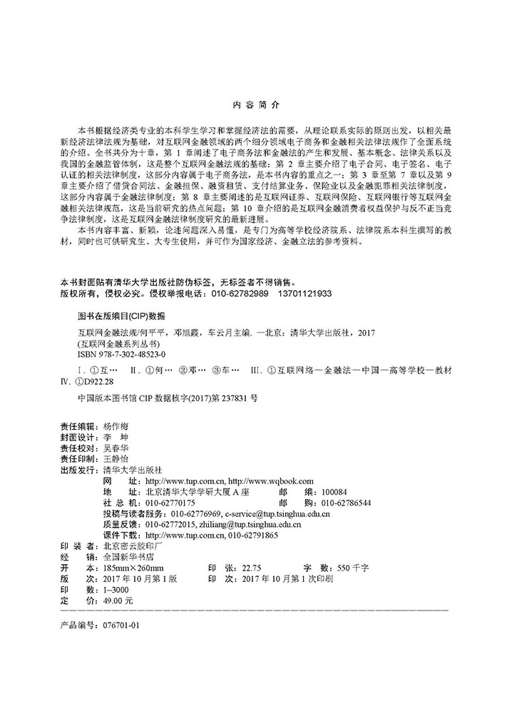 (1)内容新颖。本书新增了电子合同、电子签名、电子认证法律制度(第三章)、互联网金融法律规范(第八章)、互联网金融消费者权益保护与反不正当竞争法律制度(第十章)等前沿性法律问题,在其他金融法教材中还未涉及这一块。本书以我国新的金融法律法规为基础,参阅国内外金融法学研究的新理论成果,结合新的金融体制和金融动态,系统介绍了互联网金融所有重要的领域,如互联网基金销售、互联网保险、互联网银行等,对相关法律关系、法律问题、法律制度等做了深入研究和分析。