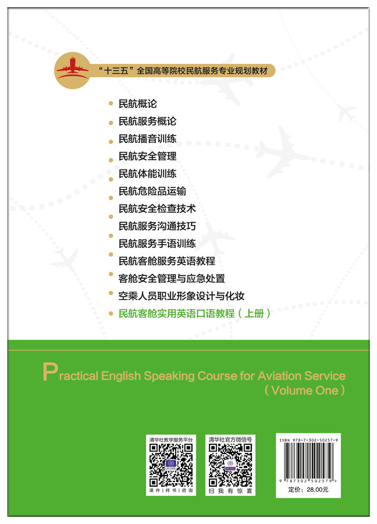 民航客舱实用英语口语教程(上册)是专门为空中乘务、民航服务、空中商务专业的学生以及有志于从事航空服务工作的学习者量身打造的空乘英语口语教材,内容涉及机场、机舱乘务职场领域,是依据工作流程较为人性化的配有语言语境及文化背景的空乘专业英语教材。