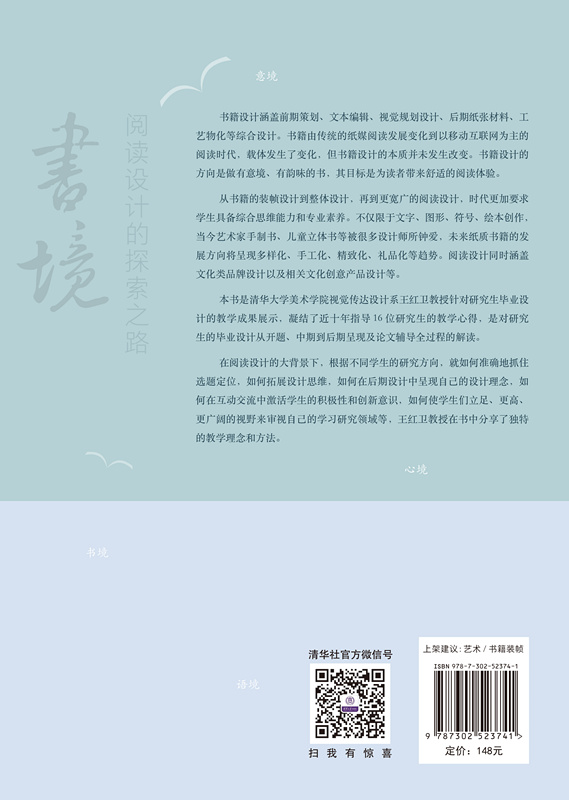 《书境——阅读设计的探索之路(研究生篇)》通过介绍11个精选的清华大学美术学院视觉传达系研究生阅读类毕业设计获奖作品,并且将每一部作品的设计制作过程从学生的角度分成多个关键节点进行详细解读。其中不仅穿插了学生的设计思路及经验总结,而且还详细记录了在毕设过程中和导师的互动过程,在实际设计案例中对阅读设计进行探索及解读,最后一章以采访的形式归纳了王红卫教授对书籍设计观点的分享及其经验之谈,供读者思考。