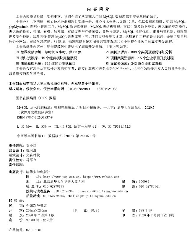 《MySQL从入门到精通(微视频精编版)》分为上下两册:核心技术分册和项目实战分册。内容浅显易懂,实例丰富,详细介绍了从基础入门到MySQL数据库高手需要掌握的知识。
