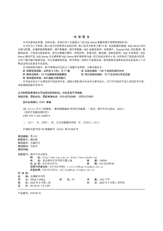 《SQL Server从入门到精通(微视频精编版)》内容浅显易懂,实例丰富,详细介绍了从基础入门到SQL Server数据库高手需要掌握的知识。全书分为上下两册:核心技术分册和项目实战分册。核心技术分册共2篇19章,包括数据库基础、SQL Server 2014安装与配置、创建和管理数据库、操作数据表、操作表数据、SQL函数的使用、视图操作、Transact-SQL语法基础、数据的查询、子查询与嵌套查询、索引与数据完整性、流程控制、存储过程、触发器、游标的使用、SQL中的事务、SQL Server高级开发、SQL Server安全管理和SQL Server维护管理等内容。项目实战分册共6章,运用软件工程的设计思想,介绍了腾宇超市管理系统、学生成绩管理系统、图书商城、房屋中介管理系统、客房管理系统和在线考试系统共6个完整企业项目的真实开发流程。