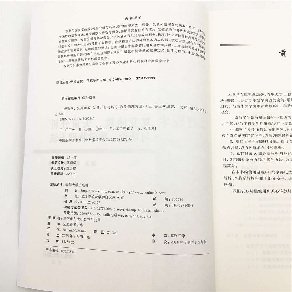 本书是在郭玉翠编著、清华大学出版社出版的《工程数学——复变函数与数学物理方法》基础上,经过5年教学实践的磨练,增删部分内容编写而成的,现呈现给广大同学和读者朋友。与清华大学出版社出版的《工程数学—复变函数与数学物理方法》相比,有以下一些改变。 1. 增加了矢量分析与场论一章内容和习题。从数学角度希望读者对这部分内容有深入了解,也为工科学生后继课程打下基础。 2. 调整了复变函数部分的内容,有些内容重新用定理描述,比如复合闭路定理,各类型孤立奇点的判定定理等,方便理解和总结归纳。 3. 增加了若干例题和习题。由于数学概念和定理很抽象,理解起来困难,为此增加例题的讲解,以方便读者学习和掌握。 4. 原有附录A和矢量分析与场论内容有关,故删去。阅读和学习数学物理方法部分时,常用到常微分方程求解的方法,为了让读者阅读和学习无障碍,增加了附录A常微分方程简介。 在本书的使用过程中,北京邮电大学的许多老师提出了具体的意见和建议。刘文军副教授、李莉副教授审阅了部分稿件。清华大学出版社给与了大力支持,在此一并表示衷心的感谢。 我们衷心期望使用和关心该教材的师生,对本书提出宝贵意见和建议。 田玉郭玉翠2018年6月