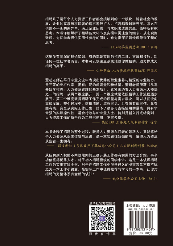 招聘工作由来已久,即便不是做人力资源管理的人,也知道招聘这项工作,甚至误以为招聘是人力资源管理全部的工作,可见招聘给人的印象之深。在人事管理阶段,招聘就已经形成。应该说,不论哪个发展阶段,只要存在雇佣关系,就一定存在招聘。虽然招聘似乎人人知晓,但只有真正从事过招聘工作的人,才能体会招聘工作的不易与复杂。 笔者科班出身,读书期间就对人力资源管理相关理论与实践方面的书籍多有涉猎,对招聘更是青睐有加。比起人力资源其他模块,招聘能接触到更多的人,对笔者这种“话不嫌多”的人再合适不过。毕业后,借着一口流利的英语,我在国外做了一年的人力资源管理工作,回国后直到现在,都在从事招聘工作。多年的实际工作经验,以及各专业学习论坛的分享累积,最终浓缩成眼前的这样一本书。它用最通俗的语言,把招聘的各个环节娓娓道来,让你在学习之余,梳理招聘流程,建立系统化的招聘程序,而且,让你对招聘工作较为高端的话题有所了解。我相信,读完本书,你对招聘工作将会有一个全新的认识。 因笔者编写水平所限,本书难免存在疏漏和不当之处,如若发现,敬请指正。 本书特色 1. 内容实在,通俗易懂,符合初学者的学习规律 本书第一部分,以拆分的形式,对招聘各个环节做了详细的介绍。从最开始对招聘的一般认知到招聘需求的分析,从招聘信息的发布到简历的筛选,从面试邀约到入职跟踪,内容翔实,包罗万象。读者可以结合自身实际情况,选择性地了解自己想要了解的部分,同时对其他方面也做一个常识性的了解。这种分布,有利于读者强化自身已经具备的能力,同时融会贯通整个招聘流程,全面提升自身的招聘能力。 2. 热点话题,抛砖引玉,引导招聘人员更深层次的...