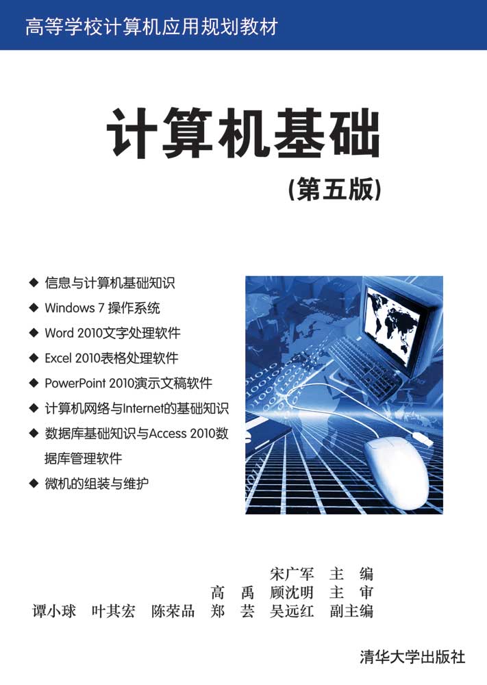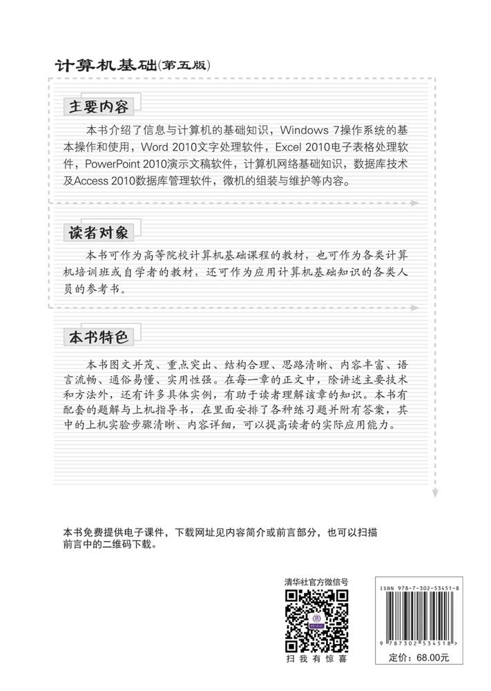 《计算机基础(第五版)》介绍信息与计算机的基础知识,Windows 7操作系统的基本操作和使用,Word 2010文字处理软件,Excel 2010电子表格处理软件,PowerPoint 2010演示文稿软件,计算机网络基础知识,数据库技术及Access 2010数据库管理软件,微机的组装与维护等内容。书中内容覆盖全国及浙江省计算机等级(一级)考试大纲规定的内容。 《计算机基础(第五版)》图文并茂、重点突出、通俗易懂、实用性强,既可作为高等院校的教材,又可作为各类计算机培训机构或自学者的教材。 为了使读者更好地掌握计算机基础知识,清华大学出版社还出版了与本教材配套的题解与上机实验辅导教材:《计算机基础题解与上机指导(第五版)》ISBN 978-7-302-53450-1。该书可作为学生上机实验、课后复习的辅导书。 《计算机基础(第五版)》配套的电子课件可以通过http://www.tupwk.com.cn/downpage网站下载,也可以扫描前言中的二维码下载。