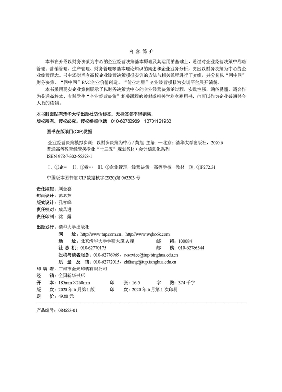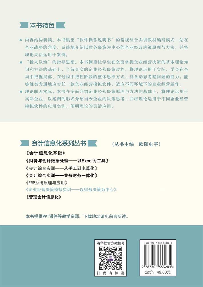 ●“授人以渔"的指导思想。本书制重让学生在全面掌握企业经营决策的基本理论知识和方法的基础上,了解真实的企业经营决策过程,将理论运用于实际,学会在全局中把握局部、在过程中把控阶段的整体思维方式,具备动态考察问题的能力,能够触类旁通地应对任一-款企业经营模拟软件,适应不同环境下的企业经营运作。