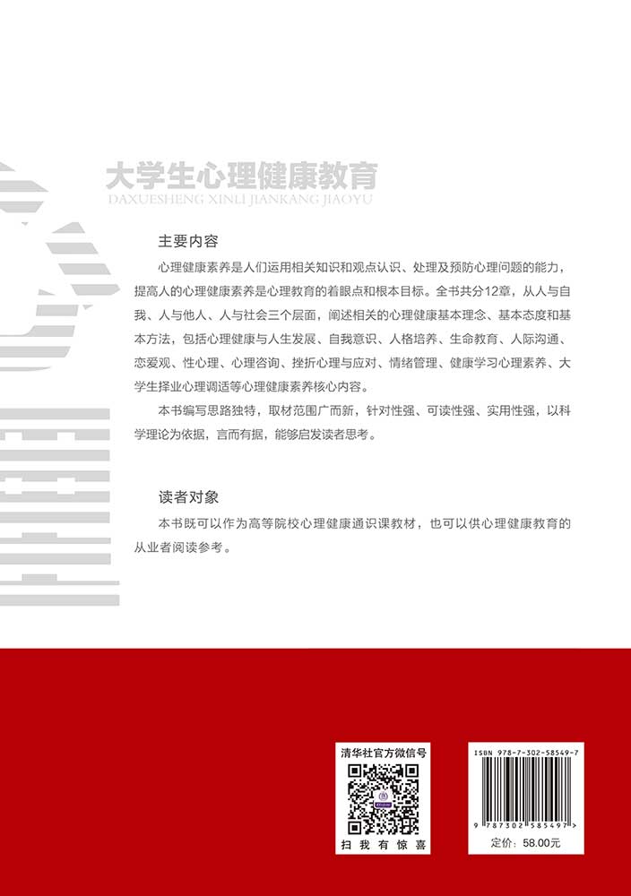 (1) 编写思路独特。与传统心理健康教育教材的体系不同,本书以心理健康素养的核心要素为主线进行分篇编排。