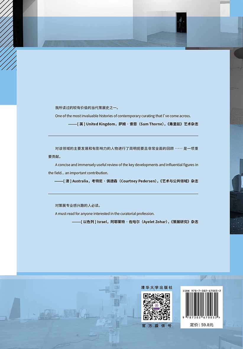 "当国际群展和双年展成为展示当代艺术的主流模式后,策展人被视为具有核心地位的文化传播者,从幕后组织者和选择者转变为显而易见的创造性活动的主导者。本书从策展实践与现状以及相关文化理论体系出发,讨论了策展如何影响艺术的展现与传播,艺术又如何改变策展,并重新审视当代策展人的角色。本书通过文化研究的方法审视当代策展制度和艺术生产机制,为艺术与文化领域的学生、研究人员、实践者提供了全球化的视野。 First MIT Press paperback edition, 2016 . 2012 Paul O'Neill All rights reserved. No part of this book may be reproduced in any form by any electronic or mechanical means (including photocopying, recording, or information storage and retrieval) without permission in writing from the publisher. The Simpli.ed Chinese-language Copyright . 2024 by Tsinghua University Press Limited under license by The MIT Press. "