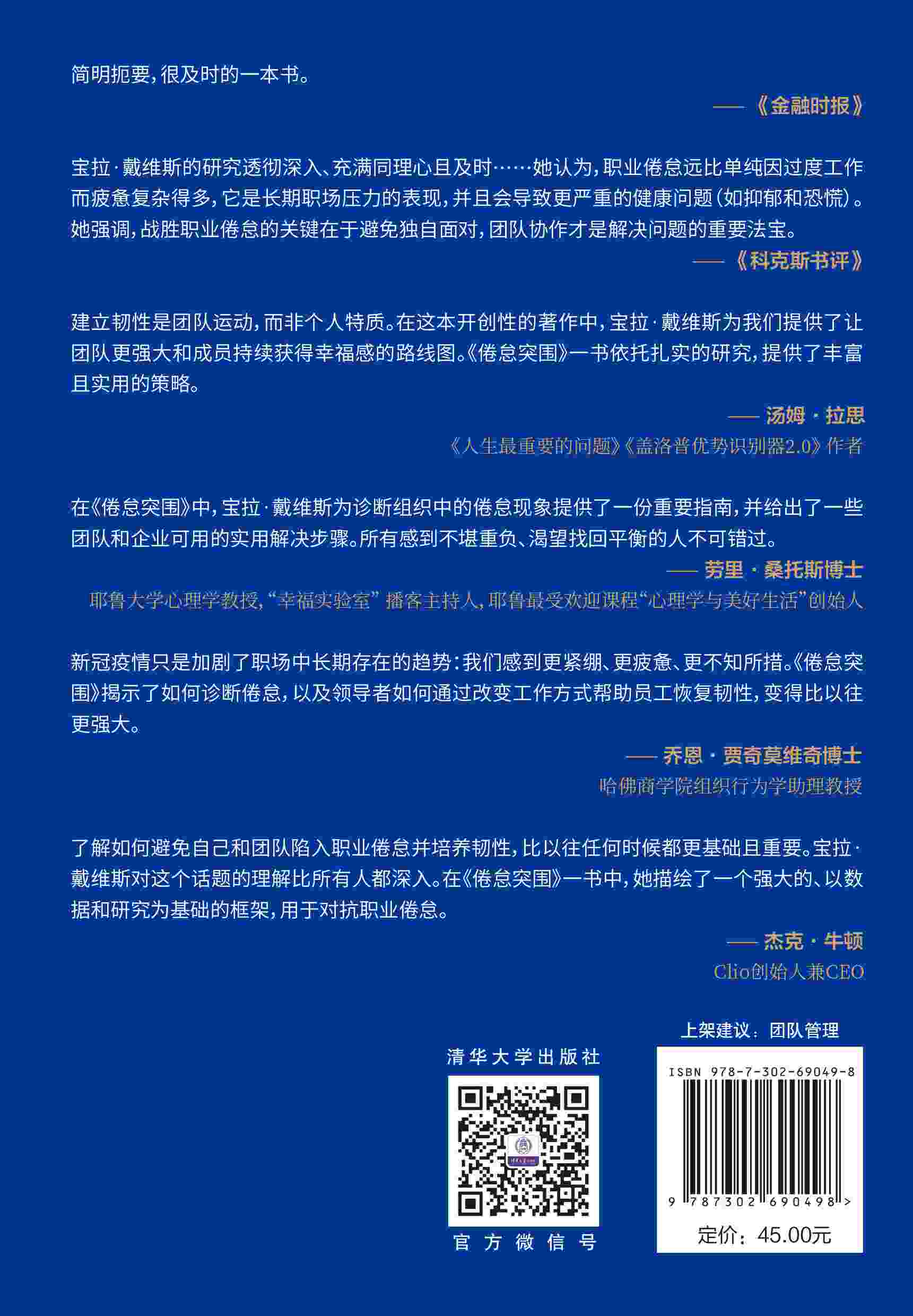 "谈到职业倦怠,不管是分析症状,还是提供解决方案,现有的讨论多关注个体层面。一个重要但经常被忽略的问题是,个体的大部分工作都是在团队中完成的,团队的管理者以及整体的状态,会极大影响到团队成员的投入程度、创造力等。 从这个角度看,要克服个体的职业倦怠,从个体所在的团队层面采取动作,会更有效和有力。这就对团队管理者提出了要求。 在《倦怠突围》这本书中,压力与韧性研究所创始人宝拉·戴维斯提供了一个新的解决方案工具包,以帮助团队管理者打造充满活力和有韧性的队伍。作者结合给不同规模的团队管理者提供指导和培训的经验,在书中给出了简单和有科学依据的策略和工具——PRIMED模型,帮助团队管理者打造拥有复原力和幸福感的团队文化,提高团队成员的工作投入度和热情,在工作中收获价值感和幸福感,进而提升整个团队的活力,在这个压力重重和充满不确定性的时代获得更多可控性。 你的管理方式,决定了你的团队是什么样子。"