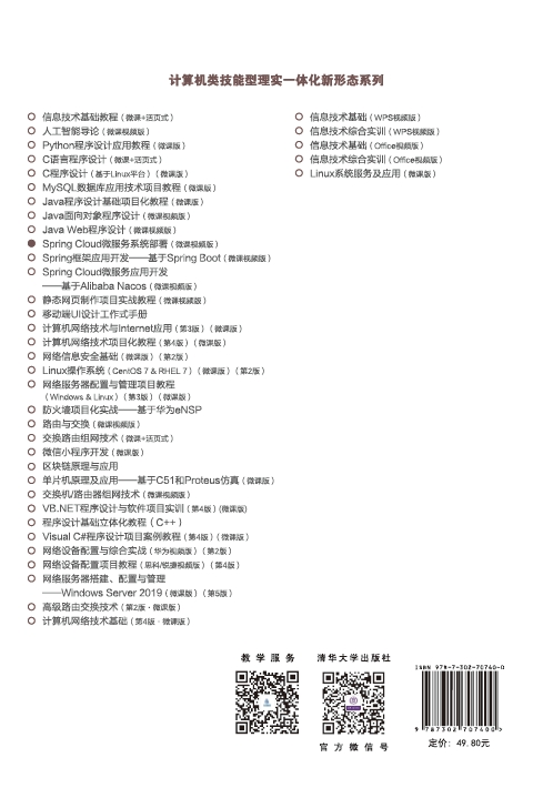 前言 部署是软件开发不可或缺的环节。容器化技术的崛起为软件开发和部署带来了新的思路和方法,尤其是基于微服务架构的分布式应用开发。将容器化技术和微服务架构相结合,可使得软件开发变得更加高效、可靠和可维护。通过将应用程序进一步拆分成微服务,开发团队可以更快地开发、测试和部署应用程序。利用容器化技术可实现开发、测试和生产环境下部署的一致性,从而减少设备和系统环境差异带来的问题。 Docker和Kubernetes是容器化技术的两个关键组件,前者是容器化平台,为应用程序提供容器化部署功能,后者则是容器化平台的协调器,用于自动管理、扩展和维护所需状态的多容器工作负载。目前它们已成为云端环境中使用最为广泛的容器化技术。 本书共7个项目,主要内容围绕微服务应用部署,以传统部署方式为基础,着重介绍容器化技术中Docker和Kubernetes组件的应用。通过本书内容,读者可以了解Docker和Kubernetes容器化技术的基础知识,掌握使用传统方式和容器化方式部署Spring Cloud微服务项目的方法和技巧。 本书全面采用“项目和任务”设计方式,以解决实际问题为导向,提出项目总体目标,再设计任务的内容。全书遵循“先易后难、由浅入深”的原则,在整体安排上,从简单的传统部署方式,逐步引入Docker、Kubernetes相关知识,以及容器化部署方式;在每个项目中,采取讲解和实践相结合的方式,由知识点逐一讲解,再到综合案例实践应用,以便读者逐步系统地掌握知识技能。 本书建议授课48学时,具体的内容结构如下。 项目1介绍Spring Cloud微服务架构解决方案、Spring ...