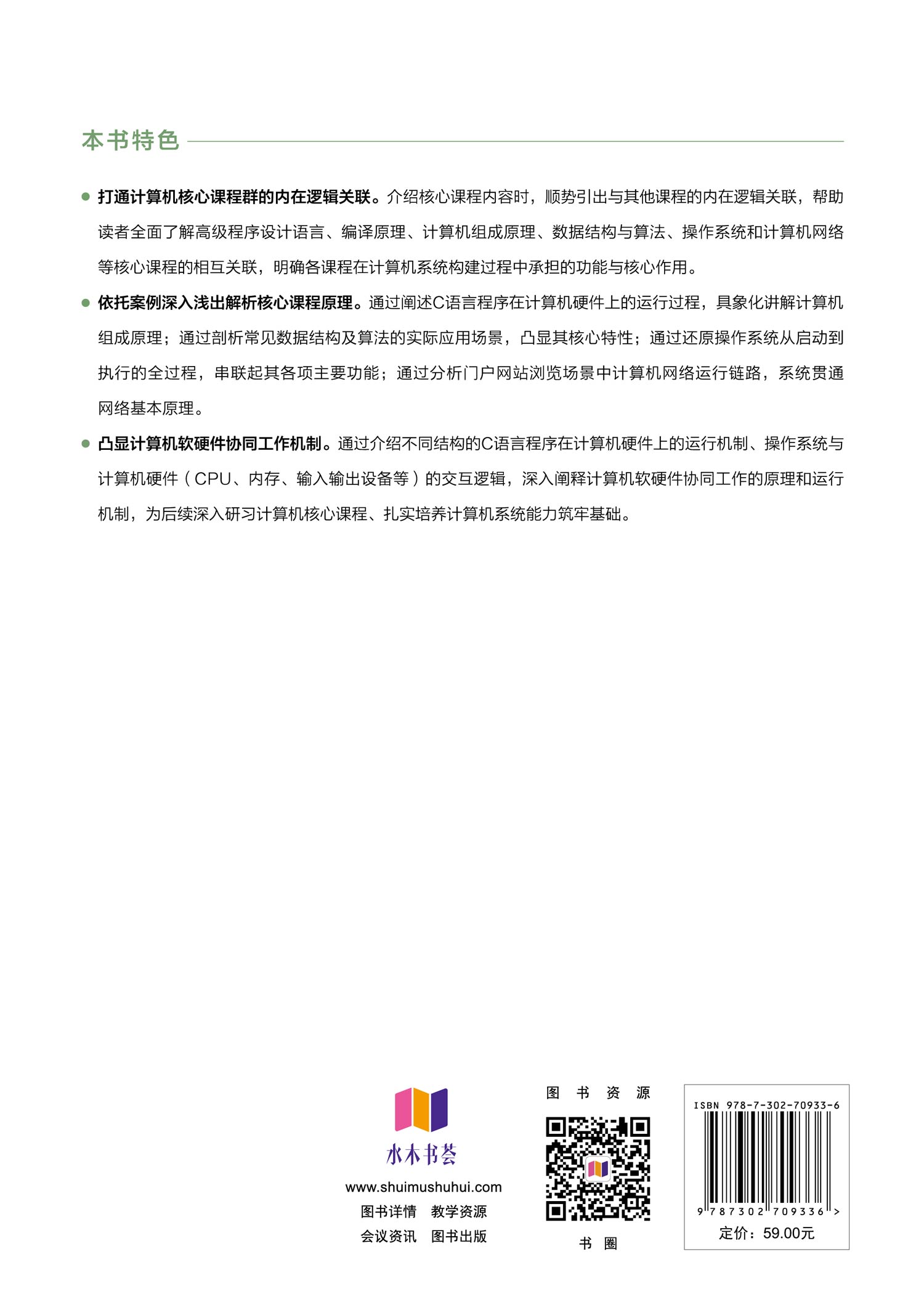 "打通计算机核心课程群的内在逻辑关联。介绍核心课程内容时,顺势引出与其他课程的内在逻辑关联,帮助读者全面了解高级程序设计语言、编译原理、计算机组成原理、数据结构与算法、操作系统和计算机网络等核心内容的相互关系,明确各课程在计算机系统构建过程中承担的功能与核心作用。