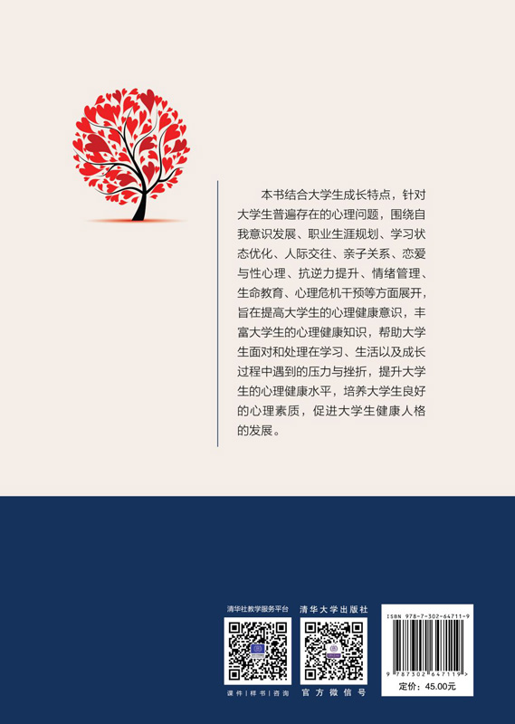 心理健康是大学生成长成才的基础。近年来,大学生心理健康问题呈上升趋势,学业压力、就业压力、人际交往等成为各种心理问题的诱因。随着社会不断进步,竞争日趋激烈,大学生的挫折承受能力却逐渐弱化,因此对大学生进行心理健康教育尤为重要。 《大学生心理健康教育》共十章,内容包括大学生自我意识发展、大学生职业生涯规划、大学生学习状态优化、大学生人际交往、大学生亲子关系、大学生恋爱与性心理、大学生抗逆力提升、大学生情绪管理、大学生生命教育、大学生心理危机干预。 《大学生心理健康教育》可作为普通高等院校心理健康教育课程的教材使用,也可作为心理健康教育工作者及普通大众的参考用书。
