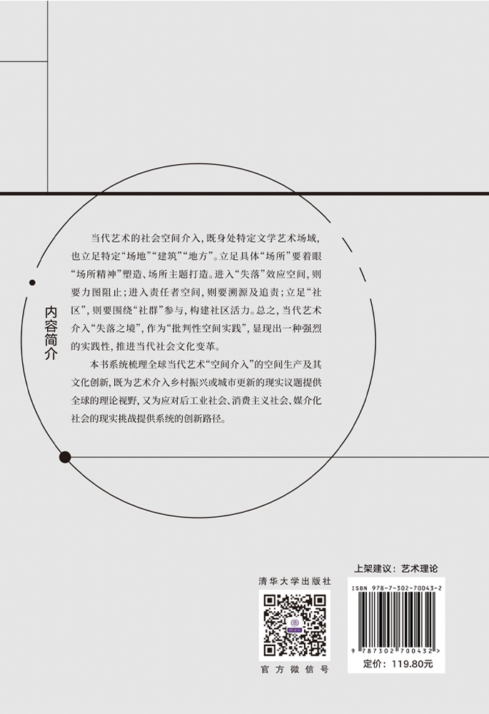 "当代艺术的社会空间介入,既身处特定文学艺术场域,也立足特定“场地”“建筑”“地方”。立足具体“场所”要着眼“场所精神”塑造、场所主题打造。进入“失落”效应空间,则要力图阻止;进入责任者空间,则要溯源及追责;立足“社区”,则要围绕“社群”参与,构建社区活力。总之,当代艺术介入“失落之境”,作为“批判性空间实践”,显现出一种强烈的实践性,推进当代社会文化变革。 《艺术介入》系统梳理全球当代艺术“空间介入”的空间生产及其文化创新,既为艺术介入乡村振兴或城市更新的现实议题提供全球的理论视野,又为应对后工业社会、消费主义社会、媒介化社会的现实挑战提供系统的创新路径。"