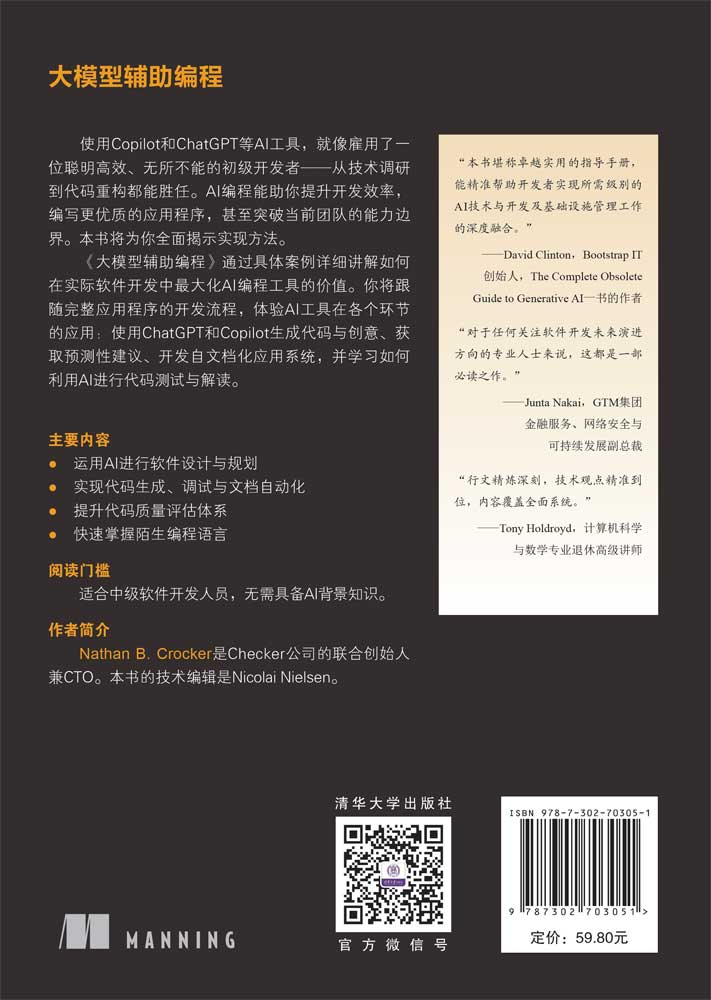 《大模型辅助编程》结构清晰,内容丰富,从基础知识到高级应用,从理论介绍到实践案例,涵盖了 GitHub Copilot 和 ChatGPT 编程的方方面面。 无论你是希望提高生产力的资深开发者,还是刚刚踏入编程世界的学习者,本书都能为你提供有益的指导。愿本书成为你的 AI 开发旅程中的一盏明灯!"