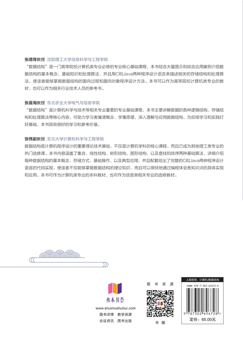 "在编写计算机程序解决实际问题之前,应该首先建立针对该问题的逻辑模型,包括相关数据的组织结构和处理算法,本书就是针对如何有效地组织数据以及如何设计处理算法而编写的。本书采用通俗易懂的语言,结合大量图示和实例,帮助读者理解和掌握数据结构相关的基本概念、基础知识和主要算法。第2章、第5章和第6章还针对最典型的线性结构、树结构和图结构给出了综合性较强的应用案例,以帮助读者综合运用所学知识解决实际问题。本书用C和Java两种程序设计语言来描述相关的存储结构和处理算 法,使学生能够掌握数据结构的面向过程和面向对象程序设计方法。本书适合作为高等院校计算机类专业“数据结构”课程的教材,也适合作为相关领域工作人员的参考图书。"