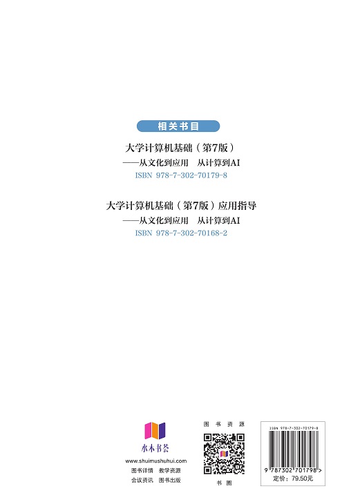 前言 当今世界,科技进步日新月异,现代信息技术深刻改变着人类的生产、生活、学习和思维方式。作为信息技术之一的计算机技术越来越普遍,在人类日常的工作、学习、生活中已经成为与语言、数学一样的必要工具和手段。 “大学计算机基础”是高等学校非计算机专业开设的计算机公共基础课,是非计算机类学生必修的一门计算机基础课程。在教育部大学计算机教学指导委员会的领导下,将计算思维融入计算机基础教学的改革已全面启动。本书在编写上引入计算思维的概念,旨在培养学生用计算思维思考和处理问题的能力,提升学生应用计算机的综合能力与素养。 本书分为6部分,分别是计算机文化与计算机系统基础、操作系统Windows 10应用、Office 2016组件(Word、Excel、PowerPoint、Access)、计算机网络基础、工具软件和算法分析基础。从计算机的发展历史,感受计算工具的变革、计算机文化的形成、计算思维的理念、信息安全以及计算机发展前沿技术;通过对Windows 10操作平台和Office 2016办公软件的学习,熟练掌握计算机操作的基本技能;通过学习互联网(包括局域网)的基本应用,掌握在实际应用中获取信息、处理信息、使用信息的能力;了解计算机病毒,掌握典型工具软件(查杀病毒、压缩备份、PDF文件阅读、屏幕录像和视频编辑、Photoshop图像处理)的安装与使用方法;最后,通过对算法的学习了解并掌握利用计算机进行问题求解的一般步骤和方法。 本书的特点是理论与实践紧密结合,注重应用;涉及的知识点多、内容丰富;重点突出,叙述简明扼要。为了实现更好的学习效果,本书配有《大学计算机基础(第7版...