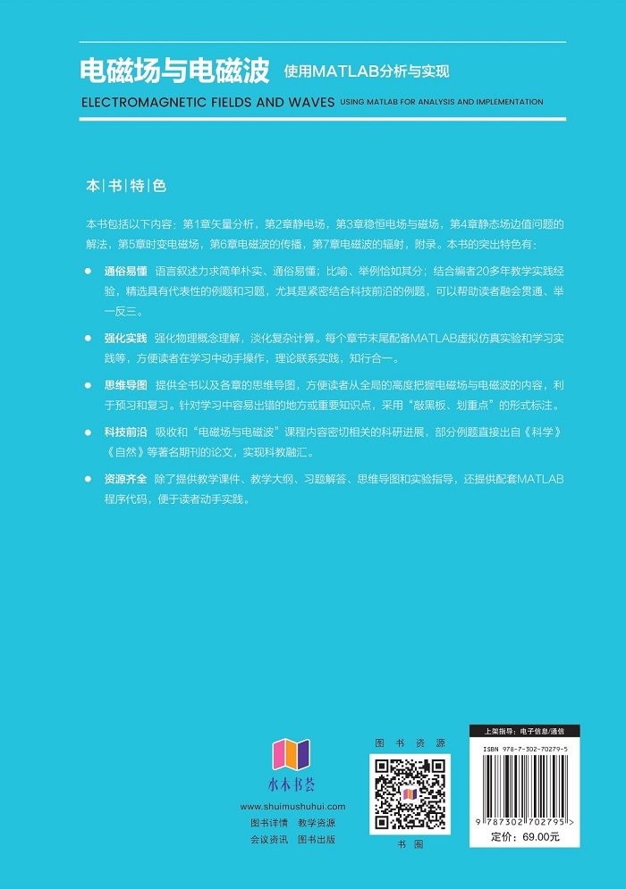 2.强化实践:教材强化物理概念理解,淡化复杂计算。每个章节之后配备MATLAB虚拟仿真实验和学习实践环节等,方便学习中动手操作。知行合一,利于理解。