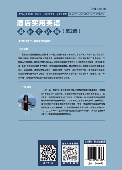 《酒店实用英语:基础会话篇(第2版)》针对酒店英语初级学习者编写。本系列教材内容体系以实际工作流程为导向,让学生自然融入真实情境,实现掌握职业英语的目的。同时贯彻党的二十大精神,巧妙融入中国特色思政元素,真正让学习入脑入心。本书紧扣《酒店运营管理职业技能等级证书》,共有6个模块、20个主题情境和60个子任务;学习内容从完成任务、解决问题入手,侧重听说训练及课堂小组讨论,配有课件和音频二维码,体现职业性、实用性、趣味性和时代感。本书既适合高职高专酒店管理专业学生的实践教学使用,也可作为酒店行业一线员工培训教材和自学读本,还适合“一带一路”沿线国家在华留学生酒店管理课程学习使用。