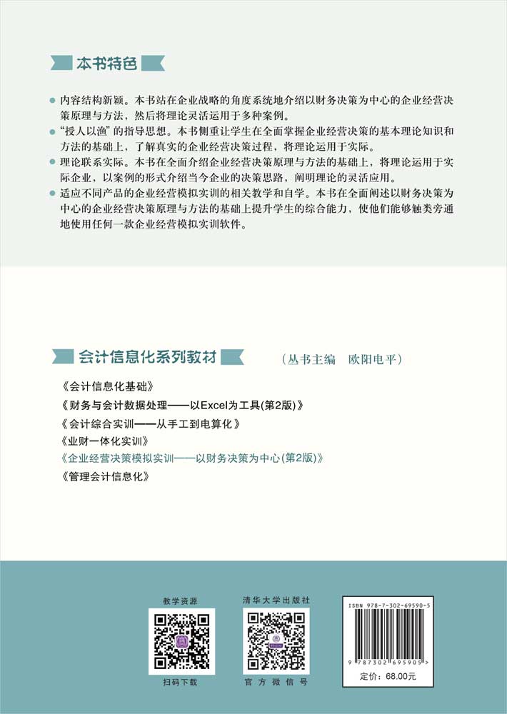 ?适应不同产品的企业经营模拟实训的相关教学和自学。本书在全面阐述以财务决策为中心的企业经营决策原理与方法的基础上提升学生的综合能力,使他们能够触类旁通地使用任何一款企业经营模拟实训软件。"