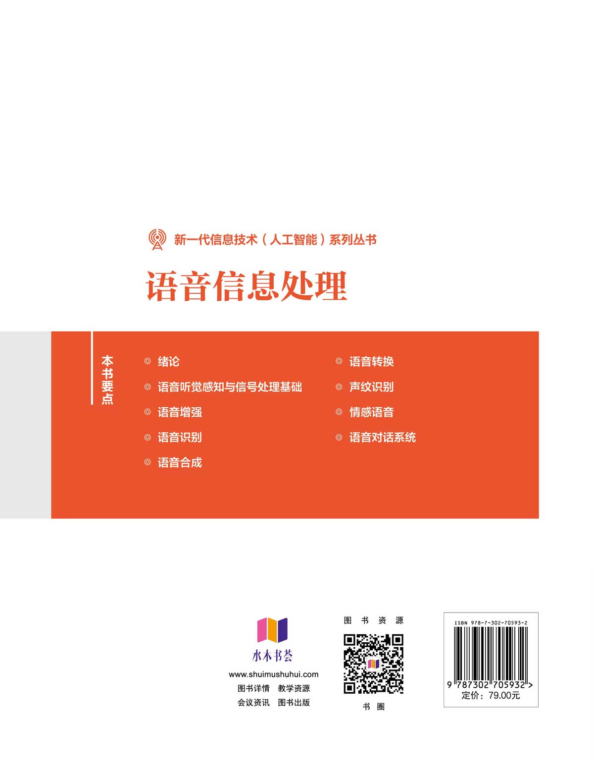 "本书是一本系统论述语音信息处理技术与方法的综合性教材。全书共9章,内容涵盖语音听觉感知与信号处理基础、语音增强、语音识别、语音合成、语音转换、声纹识别、情感语音与语音对话系统等多个关键技术方向。 第1章绪论,介绍了语音信息处理技术的发展历程与分类,并概述了全书的结构安排。 第2章语音听觉感知与信号处理基础,从语音产生机制出发,系统讲解了语音信号的时域、频域及线性预测分析等基本处理方法。 第3章语音增强,主要阐述了单通道语音增强与多通道语音增强方法。 第4章语音识别,主要介绍了语音识别技术的核心原理与典型方法,涵盖从传统混合模型到端到端建模,再到当前前沿的大模型语音识别系统。 第5章语音合成,系统介绍了语音合成技术的基本原理、主要方法及其**进展,从传统拼接式方法到基于大语言模型的端到端合成技术。 第6章语音转换,包括语音转换的基本原理、主要技术及评价方法。 第7章声纹识别,分析了声纹识别的基本原理、主流建模方法、端到端建模技术及其安全性与评价指标。 第8章情感语音,围绕情感的定义、特征提取方法、情感识别模型及其发展趋势进行了探讨。 第9章语音对话系统,介绍了发展历程、关键技术路径以及基于大模型的端到端语音对话系统与评测方法。 本书适合高校学生作为语音信息处理相关课程教材,也可作为从事语音技术研发人员的自学参考书与工程实践指南。 "