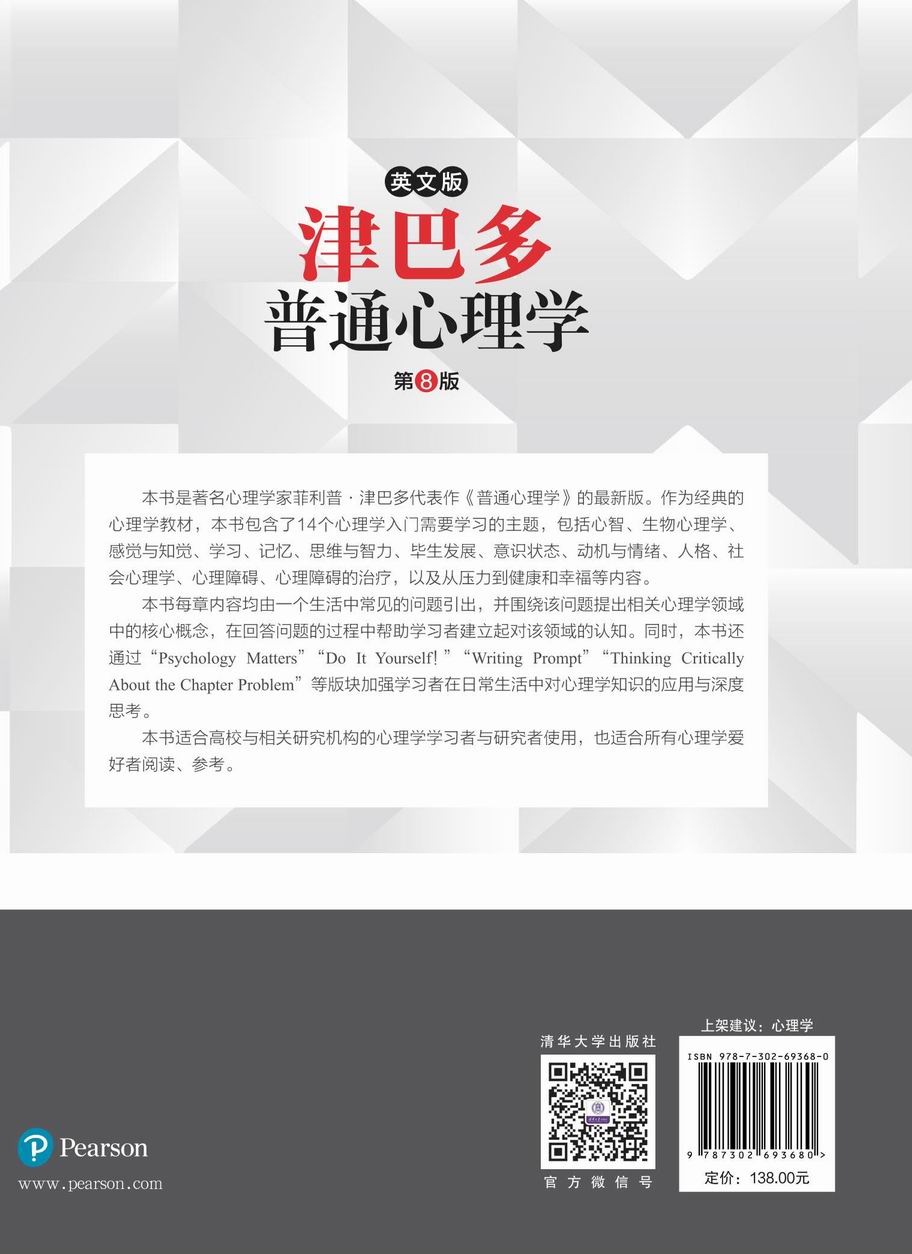 "本书是著名心理学家菲利普?津巴多代表作《普通心理学》的**版。作为经典的心理学教材,本书包含了14个心理学入门需要学习的主题,包括心智、生物心理学、感觉与知觉、学习、记忆、思维与智力、毕生发展、意识状态、动机与情绪、人格、社会心理学、心理障碍、心理障碍的治疗,以及从压力到健康和幸福等内容。 本书每章内容均由一个生活中常见的问题引出,并围绕该问题提出相关心理学领域中的核心概念,在回答问题的过程中帮助学习者建立起对该领域的认知。同时,本书还通过“Psychology Matters”“Do It Yourself!”“Writing Prompt”“Thinking Critically About the Chapter Problem”等版块加强了学习者在日常生活中对心理学知识的应用与深度思考。 本书适合高校与相关研究机构的心理学学习者与研究者使用,也适合所有心理学爱好者阅读、参考。 "