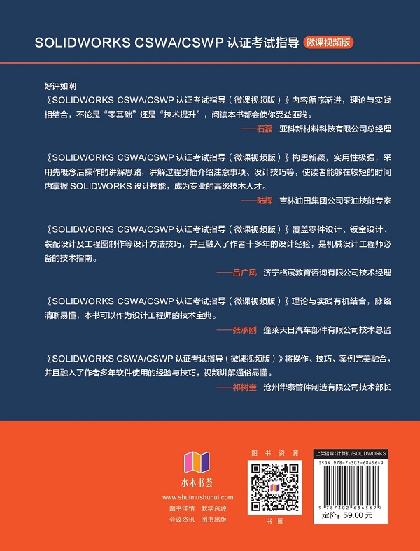 "本书循序渐进地介绍了使用SOLIDWORKS如何顺利完成CSWA/CSWP认证考试的相关内容,包括CSWA/CSWP全球认证考试简介、如何参加CSWA/CSWP认证考试、CSWA/CSWP认证考试题型与范围、CSWA/CSWP全球认证考试形式、CSWA/CSWP全球认证考试证书的发放、SOLIDWORKS概述、软件的工作界面与基本操作设置、二维草图设计、零件设计、装配设计、模型的测量与分析、工程图设计、CSWA/CSWP认证考题详解等。 为了能够使读者更快地掌握该软件的基本功能顺利通过CSWA/CSWP考试,在内容安排上,书中结合大量的案例对SOLIDWORKS软件中的一些抽象的概念、命令和功能进行讲解;在写作方式上,本书采用软件真实的操作界面,采用软件真实的对话框、操控板和按钮进行具体讲解,这样就可以让读者直观、准确地操作软件进行学习,从而尽快入手,提高读者的学习效率。 本书内容全面、条理清晰、实例丰富、讲解详细、图文并茂,可以作为高等院校学生和各类培训学校学员的SOLIDWORKS上课或者上机练习素材,也可作为广大工程技术人员学习SOLIDWORKS的自学教材和参考书籍。 "