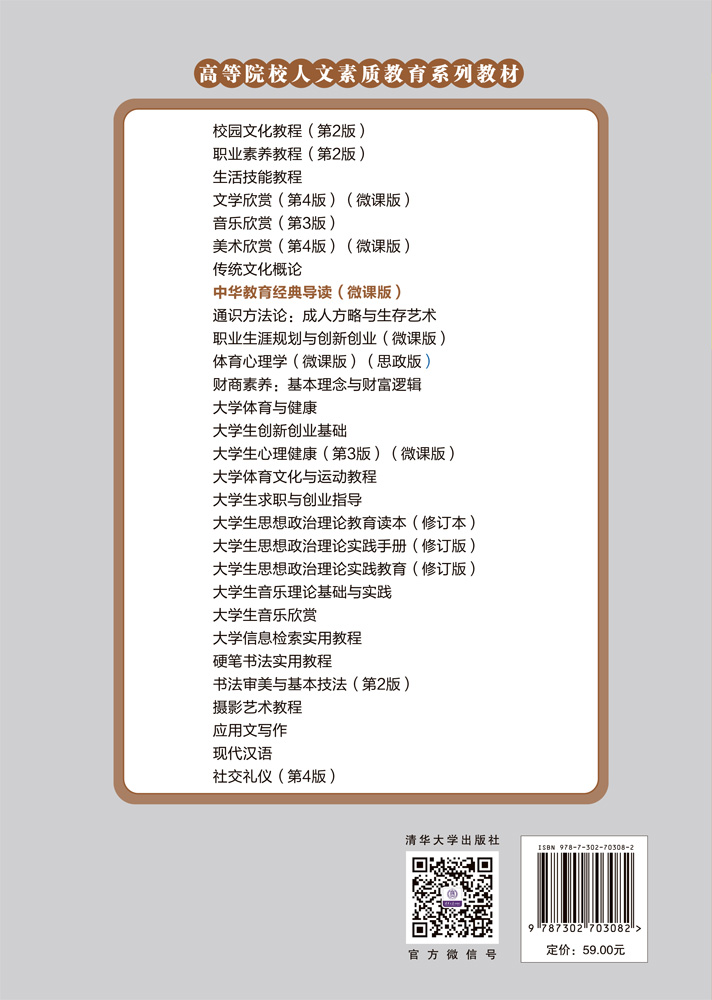"《中华教育经典导读(微课版)》选取中国教育史上最有影响力的名篇名著,分两部分展开论述。古代部分主要选取中国古代***的教育典籍,如《论语》《孟子》等。近现代部分主要编入近现代著名教育家的名篇,如张之洞的《劝学篇》、蔡元培的《就任北京大学校长之演说》、李蒸的《战后中国师范教育方针》等。这些著作是中华优秀文化的重要组成部分,我们希望通过导读,可以使这些经典得以传承。书中不仅介绍了著作诞生的时代背景及作者的哲学观、教育观,而且还选取了其中的重要篇章加以分析,撷取历史的智慧和教训,为当代教育提供借鉴和启示。 《中华教育经典导读(微课版)》既适合作为教育学专业和其他各类专业本、专科学生提高教育学专业素养的通识类教材,也可以作为教育从业者的必读书籍。 "