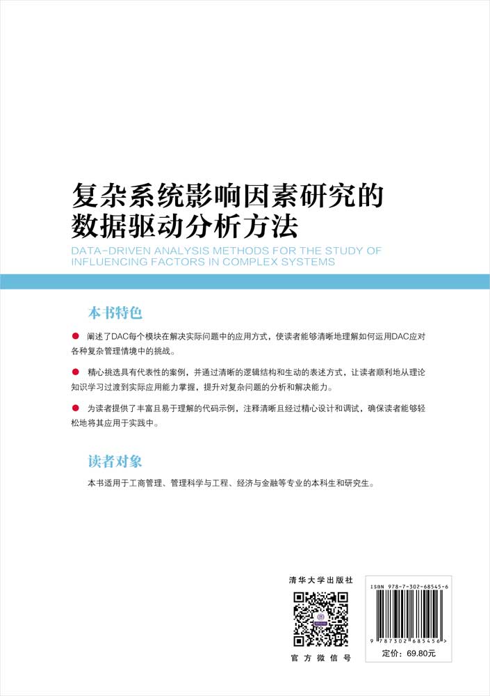 "《复杂系统影响因素研究的数据驱动分析方法》聚焦于复杂系统影响因素研究的数据驱动分析方法(DAC),为应对大数据和人工智能时代复杂系统问题提供创新思路与实用工具。第1章阐述了传统分析方法在处理复杂系统多变量、非线性和动态变化等特征时的不足,而DAC凭借先进的数据挖掘和机器学习算法,通过数据获取、数据处理与变量测量、聚类分析、决策树分析和贝叶斯网络分析5个关键阶段(步骤),为决策制定和优化助力。第2章强调指标选取的依据、选取原则等,依据数据类型选择合适量化方法,并通过实例演示如何将实际问题转化为可量化数据集,保障后续分析质量。第3章详细介绍数据采集、统计分析、变量选取、校准处理(引入云校准概念)等数据预处理内容。第4章讲解基于聚类算法的异质性群体的多种分析。第5章使用决策树分析了异质性群体对象的影响因素交互效应。第6章运用贝叶斯网络和相关算法探究变量间的作用关系和影响路径。第7章通过后发企业创新绩效案例分析,展示 DAC在实际研究中的应用优势。 本书特色鲜明,内容紧密围绕解决复杂管理问题,案例丰富且分析透彻,从多领域实际问题出发,旨在增强读者对方法的理解与应用能力。本书中代码示例详细,可操作性强。本书适用于工商管理、管理科学与工程、经济与金融等专业的本科生和研究生,为他们开展学位论文研究和学术探索提供新颖视角和方法,帮助他们掌握这一跨学科融合的研究范式。"