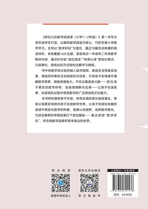 "《好玩儿的数学阅读课(小学1-2年级)》是一本专为低年级学生打造,以趣味数学阅读为核心,巧妙衔接小学数学学习。全书以“数学好玩”为理念,通过78篇生动有趣的阅读材料,系统覆盖16大主题,紧密贴合一年级和二年级数学教材内容,重点针对如“退位减法”“钟表认读”等知识难点,以故事化、游戏化的方式轻松化解学习障碍。 书中将数学知识自然融入超市购物、家庭生活等真实场景,借助同伴角色互动和探究式任务,引导孩子在情境中理解数学思想、锻炼思维能力。不仅注重激发兴趣——回应孩子真实的数学好奇,也强调理解与应用——让孩子在读故事、玩游戏的过程中感受数学的广泛用途和文化魅力。 本书特别推荐亲子共读,附有实用的家长指导建议,帮助父母更好地陪伴孩子走进数学世界。让孩子在轻松有趣的阅读中萌发对数学的热爱,拓展认知视野,培养数学眼光,为综合素养的早期发展打下坚实基础——真正体验“数学好玩”,学会用数学观察和思考身边的世界。 "
