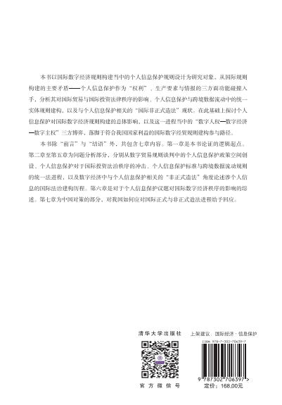 "本书以国际数字经济规则构建当中的个人信息保护规则设计为研究对象,从国际规则构建的主要矛盾个人信息保护作为""权利"",生产要素与情报的三方面功能碰撞入手,分析其对国际贸易与国际投资法律秩序的影响,个人信息保护与跨境数据流动中的统一实体规则建构,以及与个人信息保护相关的""国际非正式造法""现状。在此基础上探讨个人信息保护对国际数字经济规则构建的总体影响,以及这一进程当中的""数字人权一数字经济数字主权""三方博弈,落脚于符合我国国家利益的国际数字经贸规则建构参与路径。 本书除""前言""与""结语""外,共包含七章内容。第一章是本书论证的逻辑起点。第二章至第五章为问题分析部分,分别从数字贸易规则谈判中的个人信息保护政策空间创设,个人信息保护对于国际投资法治秩序的冲击,个人信息保护标准与跨境数据流动规则的统一法进程,以及数字经济中与个人信息保护相关的""非正式造法""角度论述涉个人信息的国际法治建构历程。第六章是对于个人信息保护议题对国际数字经济秩序的影响的综述。第七章为中国对策的部分,对我国如何应对国际正式与非正式造法进程给予回应。"