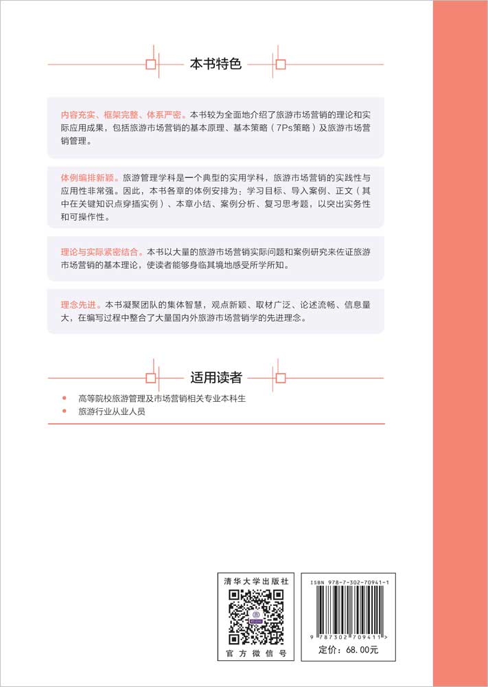 ?体例编排新颖。旅游管理学科是一个典型的实用学科,旅游市场营销的实践性与应用性非常强。因此,本书各章的体例安排为:学习目标、导入案例、正文(其中在关键知识点穿插实例)、本章小结、案例分析、复习思考题,以突出实务性和可操作性。
