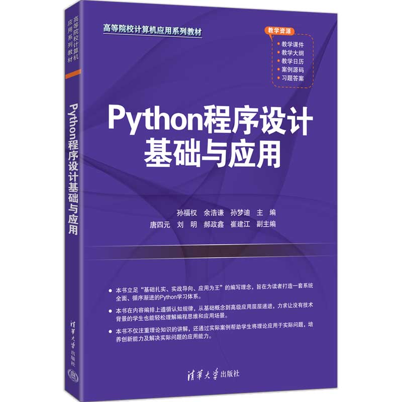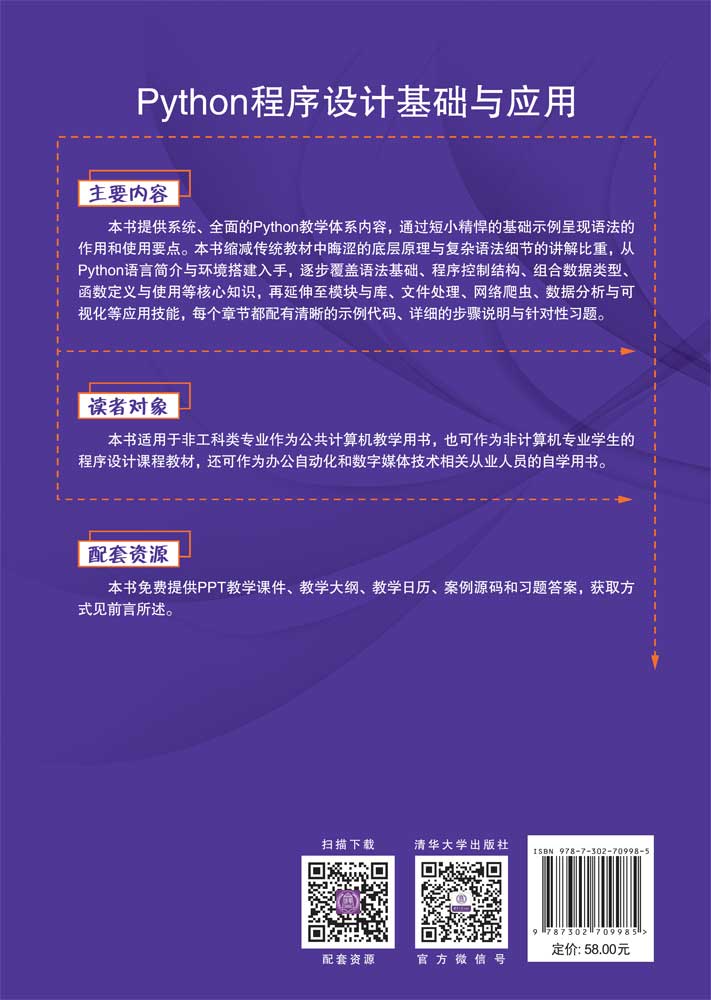 "《Python程序设计基础与应用》提供系统、全面的python入门指导,通过短小精悍的基础示例呈现语法的作用和使用要点。本书减少传统教材中晦涩的底层原理与复杂语法细节的讲解比重,从Python语言简介与环境搭建入手,逐步覆盖语法基础、程序控制结构、组合数据类型、函数定义与使用等核心知识,再延伸至模块与库、文件处理、网络爬虫、数据分析与可视化等应用技能,每个章节都配有清晰的示例代码、详细的步骤说明与针对性习题。 本书由浅入深、层层递进,不仅注重理论知识的讲解,还通过实际案例和项目实践帮助学生将理论应用于实际问题。在内容编排上遵循认知规律,从基础概念到高级应用层层递进,采用通俗易懂的语言,避免复杂的公式和术语,力求让没有技术基础的学生也能轻松理解python编程思维和应用场景。 本书旨在为高等院校的学生提供一本通俗易懂、内容全面的python编程入门教材,适用于非工科类专业作为公共计算机教学用书,也可作为非计算机专业学生的程序设计课程教材,还可以作为办公自动化和数字媒体技术相关从业人员的自学用书。"