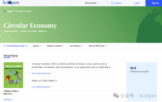 Since it starts publication, Circular Economy has been successively included in internationally renowned databases such as Scopus and Ei Compendex. Its CiteScore 2024, released in June 2025, is 10.0, ranking 27 (top 10%) in the Environmental Science (miscellaneous) subject category. Being included in ESCI, a globally significant database, indicates that the academic level of Circular Economy has been further recognized by the international academic community. This achievement is of great importance for expanding the journal's reach, increasing its visibility, and enhancing its academic influence.