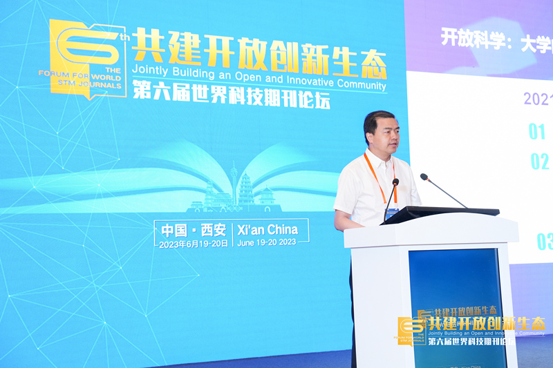 2023年6月19日,由中国科学技术协会、中国科学院、中国工程院、陕西省人民政府共同举办的第六届世界科技期刊论坛在陕西西安开幕。论坛以“共建开放创新生态”为主题,聚焦开放科学背景下科技期刊发展的重点问题,邀请国内外知名科技团体、学术机构、出版机构的专家学者,共同探讨开放科学发展、出版模式转型、大数据与人工智能技术应用、期刊集群品牌打造等热点话题。校党委副书记向波涛出席此次论坛并作“推进开放科学,共建开放创新生态”的主旨报告。