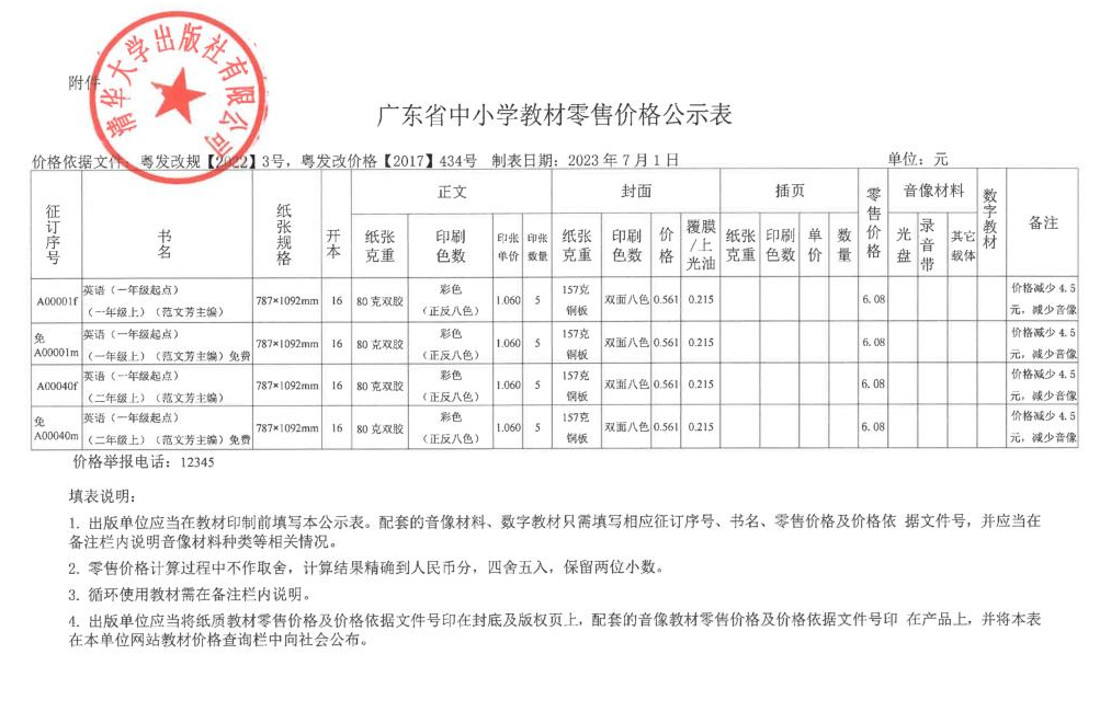 按照广东省教育厅《关于做好2023年秋季中小学教学用书征订工作的通知》的要求,我社《小学英语》2023年秋季学期教材供货需填报“广东省中小学教材零售价格公示表”(见图),并将公示表在本单位网站教材价格查询栏中向社会公布。