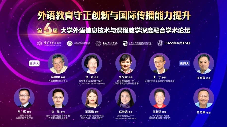 4月16日,由清华大学出版社、上海交通大学外国语学院、上海杉达学院外语学院、上海时代教育出版研究中心联合主办的第六届大学外语信息技术与课程教学深度融合学术论坛在“水木云讲堂”直播平台成功举行。本届论坛以“外语教育守正创新与国际传播能力提升”为主题,邀请了外语界专家学者与各高校外语院系负责人相聚云端,凝聚共识,共谋发展。会议全程直播,吸引了全国逾1.1万人次的线上观看。