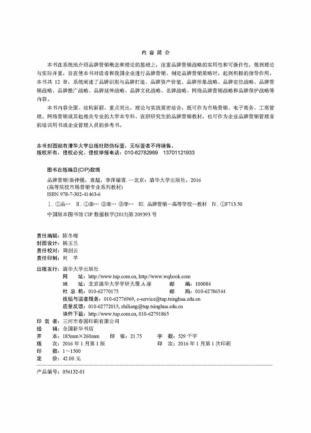 本书在系统地介绍品牌营销概念和理论的基础上,注重品牌营销战略的实用性和可操作性,做到理论与实际并重,旨在使本书对读者和我国企业进行品牌营销、制定品牌营销策略时,起到积极的指导作用。本书共12章,系统阐述了品牌识别与品牌打造、品牌资产价值、品牌形象战略、品牌定位战略、品牌营销战略、品牌推广战略、品牌延伸战略、品牌文化战略、名牌战略、网络品牌营销战略和品牌保护战略等内容。 本书内容全面、结构新颖、重点突出,理论与实践紧密结合,既可作为市场营销、电子商务、工商管理、网络营销或其他相关专业的大学本专科、在职研究生的品牌营销教材,也可作为企业品牌营销管理者的培训用书或企业管理人员的参考书。
