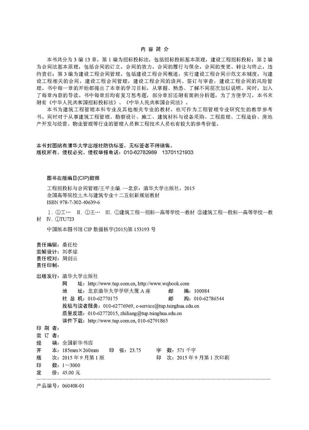 本书共分为3编13章,第1编为招标投标法,包括招标投标基本原理,建设工程招标投标;第2编为合同法基本原理,包括合同的订立,合同的效力,合同的履行与保全,合同的变更、转让与终止,违约责任;第 3 编为建设工程合同管理,包括建设工程合同概述,实行建设工程合同示范文本制度,与建设工程相关的合同,建设工程合同管理,建设工程合同的谈判、签订与审查,建设工程合同的风险管理。书中每一章的开始都提出了本章的学习目标,从掌握、熟悉、了解不同层次加以说明。同时,加入了每章内容的导读。书中每章后均有复习思考题,部分章后还附有案例分析题,为了方便学习,本书末附有《中华人民共和国招标投标法》、《中华人民共和国合同法》。 本书为建筑工程管理本科专业及其他相关专业的教材,也可作为工程管理专业研究生的教学参考书。同时对于从事建筑工程管理、勘察设计、施工、建筑材料与设备采购、工程监理、工程造价、房地产开发与经营、物业管理等行业的管理人员和工程技术人员也有较大的参考价值。