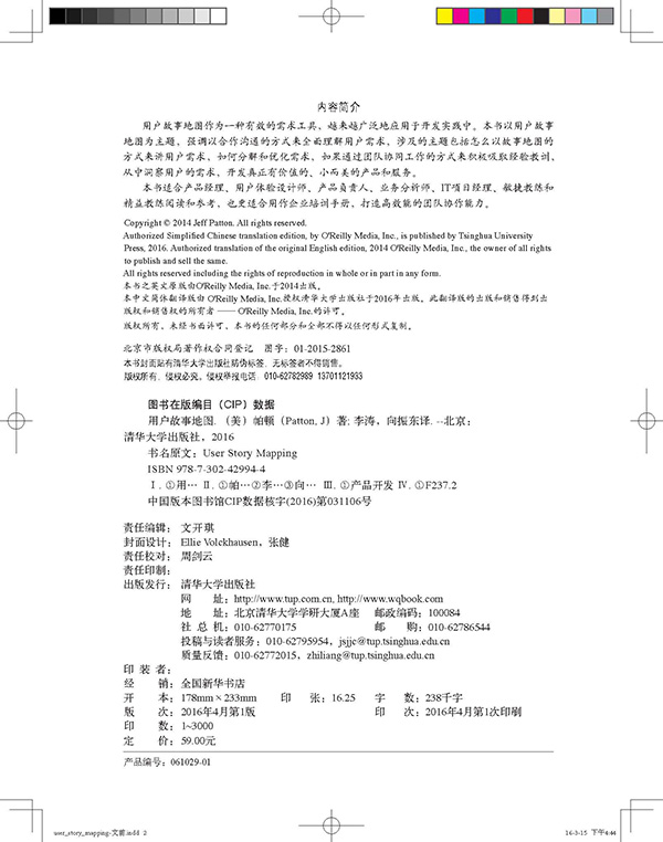 作者介绍Jeff Patton在过去二十多年的经历中,Jeff Patton得到一个教训:虽然设计和构建软件的正确方式并不只有唯一一种,但错误的更是多得数不胜数。Jeff有十五年丰富的产品经验,做过网上飞机零件预定和电子病历卡等,主要是帮助客户组织改进工作方式。在很多开发流程都只着眼于交付速度和效率时,Jeff早已经在此基础上同时兼顾交付具有非凡价值并且能获得市场成功的软件产品。早在2000年,Jeff加入一个早期的极限编程团队以来,就一直专注于敏捷方法,尤其专长于把有效用户体验设计和产品管理实践融入扎实的工程实践当中。目前,Jeff的身份是独立顾问、敏捷过程教练、产品设计过程教练和导师。他针对敏捷产品管理各个主题所发表过的文章、随笔和PPT都可以从agileproductdesign.com和Alistair Cockburn的Crystal Clear找到。Jeff是敏捷-使用性雅虎讨论小组的创办人和协调人,StickyMinds.com和IEEE Software的专栏作者,CST(Certified Scrum Trainer),敏捷联盟2007 Gordon Pask奖的获得者。译者介绍李涛花名“大桃”(微信号:whoistony),百度资深敏捷教练、高级架构师,现为百度用户产品体系内部顾问团队负责人。2012年加入百度,一直工作在移动互联网、LBS、O2O产品敏捷转型的第一线,积累了业务与敏捷结合的丰富经验。带领团队辅导百度地图、百度团购、百度导航、百度旅游等产品的敏捷转型工作,取得显著成效。2014年负责百度糯米的产品研发融合和敏捷转型工作。向振东花名“阿东”(微信号:jedheong),北京师范大学心理学硕士,目前就职于京东,专门从事用户研究和数据分析相关工作。对用户体验研究和项目管理领域的翻译与交流很感兴趣,目前也是UXRen翻译组管理员。