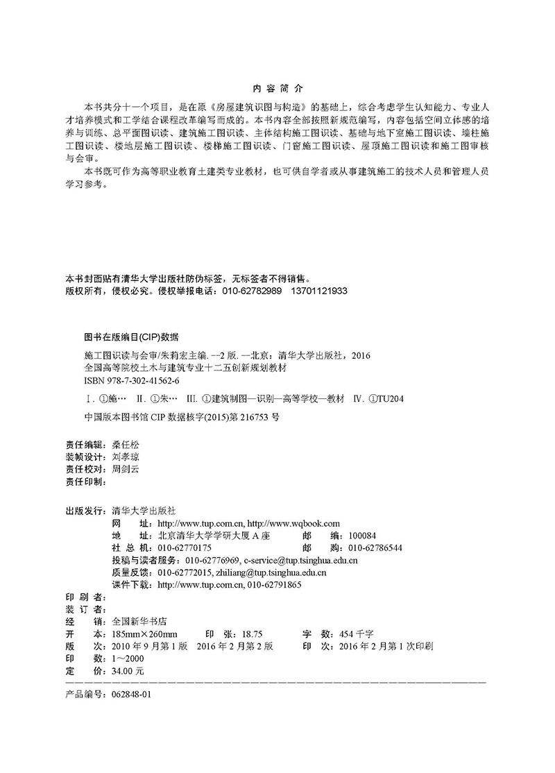 前 言 近年来,随着我国高等职业教育不断向纵深发展,在深化教育教学改革、创新人才培养模式、提高社会服务能力等方面取得较大进展。课程标准、学习目标、学习情境、工学结合、项目教学等课程改革模式日臻完善,我们编写了《施工图识读与会审》(第2版)一书。 “施工图识读与会审”是普通高等职业教育土建类专业的主要专业基础课程之一,本着“必需、够用、适度,以职业能力培养为导向”原则,优化整合知识结构,探讨学生认知规律,密切结合职业岗位需求,力求做到引领职业实践活动,也为后续课程学习做铺垫。本书将建筑识图与建筑构造两部分内容整合于施工图识读,以施工图贯穿始终,并结合工作岗位实际增加了施工图审核和会审的工作内容,是职业教育教学的一次重大变革。 本书可读性强,逻辑缜密,符合认知规律;实用性、实践性、可操作性进一步优化;采用现行新标准、新规范编写,有利于职业指导,培养职业素养。 本书由辽宁建筑职业学院朱莉宏任主编,王立红任副主编,丁春静任主审。朱莉宏编写了项目一至项目十及附录部分;王立红编写项目十一。 尽管编者有20多年从事土建工程教学和实践的经验,但由于水平有限,书中难免有错误和缺陷,敬请专家和读者不吝赐教。 编 者