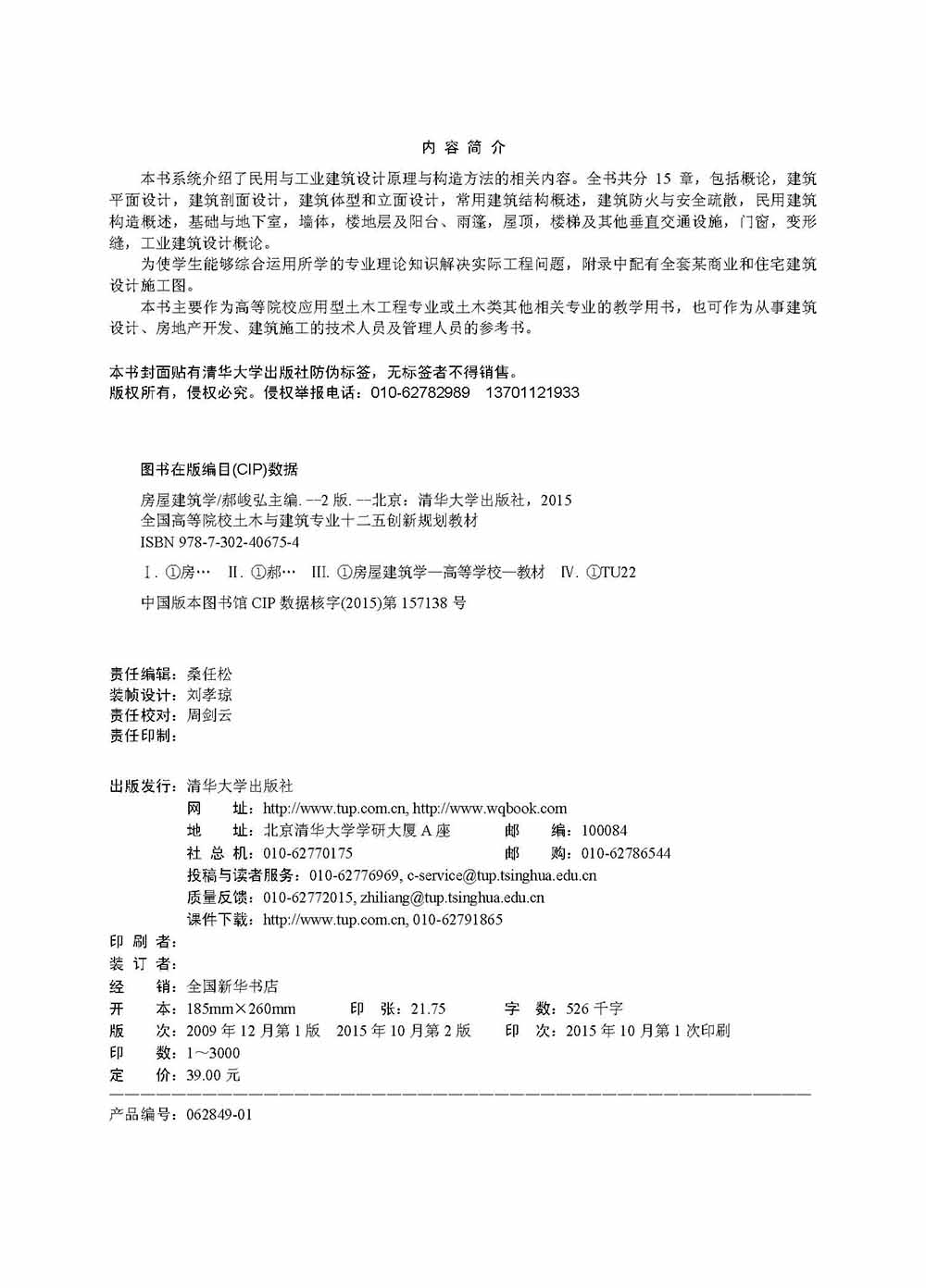 本书系统介绍了民用与工业建筑设计原理与构造方法的相关内容。全书共分15章,包括概论,建筑平面设计,建筑剖面设计,建筑体型和立面设计,常用建筑结构概述,建筑防火与安全疏散,民用建筑构造概述,基础与地下室,墙体,楼地层及阳台、雨篷,屋顶,楼梯及其他垂直交通设施,门窗,变形缝,工业建筑设计概论。 为使学生能够综合运用所学的专业理论知识解决实际工程问题,附录中配有全套某商业和住宅建筑设计施工图。 本书主要作为高等院校应用型土木工程专业或土木类其他相关专业的教学用书,也可作为从事建筑设计、房地产开发、建筑施工的技术人员及管理人员的参考书。