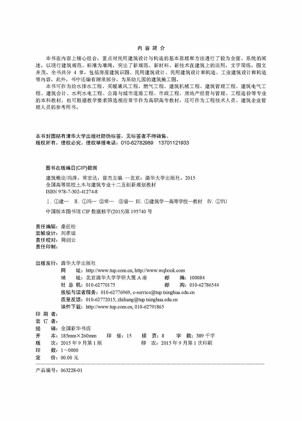 前 言 “建筑概论”课程是土木工程专业及其他相关专业的专业基础课,是一门综合性和实践性很强的课程。随着建筑业的飞速发展,以及建筑材料和新技术的不断涌现,该课程所需涵盖的内容日益增多,涉及面越来越广。为了适应当前高校教学计划、教学学时的调整要求,并适应卓越工程师教育培养计划,本书在内容上精心组合,以现行建筑规范为准绳,以最新的工程案例为背景,通过对建筑设计原理和构造方法等的讲解,使广大读者能够掌握建筑的基本知识。 全书共分4章。第1章是房屋建筑识图,通过识图为读者建立起完整的建筑空间概念,以利于建筑施工图纸的识读与绘制。第2、3章是民用建筑设计和民用建筑构造,是本书的重点。该部分结合国家规范、标准,对民用建筑设计和构造的基本原理和方法进行了较为全面、系统的阐述。第4章是工业建筑设计和构造,阐述了工业建筑的特点、设计原理与构造方法等。为强化施工图的识读,提高读者的综合应用能力,书中还编有附录部分,给出了某幼儿园的建筑施工图。此外,各章后均附有简答题和观察思考题,意在通过这些问题将所学理论知识与实践环节紧密结合,通过思考加深对建筑的认识。第1、3章后还附有实践动手题,以加强工程实践能力的培养。 本书编写分工如下:绪论、第1、2章由北京建筑大学建筑学院冯萍编写;第3章的3.1~3.6节由北京建筑大学土木学院曾杰编写,第3章的第3.7和3.8节及第4章由北京建筑大学土木学院常宏达编写。全书由北京建筑大学建筑学院樊振和教授主审。 本书适用于普通高等学校给水排水工程、采暖通风工程、燃气工程、建筑机械工程、建筑管理工程、建筑电气工程、建筑会计、水利...