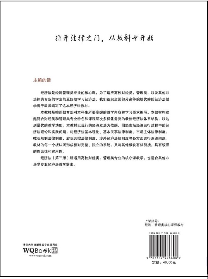 经济法是经济管理类专业的核心课,本书以现行的经济立法为依据,围绕市场经济运行过程中的经济法理论和实践问题,对经济法基本理论、基本民事法律制度、市场主体法律制度、微观规制法律制度、宏观调控法律制度、涉外经济法律制度和经济纠纷解决法律制度等各方面进行系统阐述。本书的每一个板块既形成相对完整、独立的系统,又与其他板块有机衔接,具有较强的理论性和实用性。 本书的逻辑结构依次为:经济法基本理论、基本民事法律制度、市场主体法律制度、微观规制法律制度、宏观调控法律制度、涉外经济法律制度。 本书也适合其他非法学专业经济法教学需求。