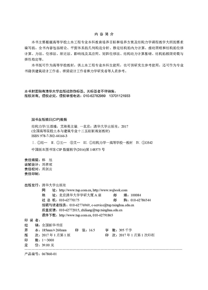 前 言 本书以教育部高等学校力学基础课程教学指导委员会制订的"结构力学课程教学基本要求"为依据,着重培养学生分析问题、解决问题的能力。本书可作为独立学院土木工程专业、土木建筑类及其他专业的教学用书,也可供从事土木工程勘测、设计、施工、监理、科研和管理等相关人员的学习参考。 "结构力学"是土木工程专业一门重要的专业基础课。它以"高等数学""理论力学""材料力学"等课程为基础;同时,它又是"混凝土结构设计原理""钢结构设计原理""土力学与地基基础""结构抗震""砌体结构"等专业课程的基础。该课程在专业基础课与专业课之间起着承上启下的作用。本书在选择和编写教材内容时,根据独立学院的整体建设规划目标及发展方向,针对独立学院的学生编写。独立学院的人才培养目标是以通识教育为基础,培养学生理论联系实际,用其所掌握的知识和技术解决实际问题的能力。本书重点突出,内容简单扼要,既方便教师教学,也方便学生自学。本书为土木工程专业学生编写,未编写动力学部分。 本书由北京科技大学天津学院教师王邵臻、艾海英担任主编,北京科技大学天津学院教师石晓娟、杨建功担任副主编,北京科技大学刘胜富教授担任主审。本书第5章、第10章由王邵臻编写,第6章、第8章由艾海英编写,第1~4章由石晓娟编写,第7章、第9章由杨建功编写。王邵臻负责全书统稿,汤华鑫负责制图和图片处理工作。 书中借用的图片、图标的作者请与本书编写人员联系。由于编者水平有限,编写时间仓促,书中难免有疏漏、不足乃至错误之处,恳请广大读者批评指正,以利修订及更正。感谢大家对本教材的关心和支持。 ...