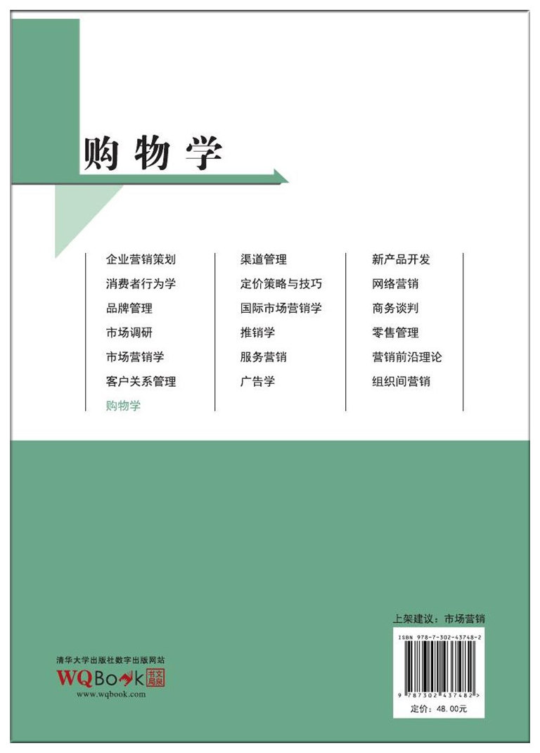 本书共包括八章内容,集中研究了购物学的产生、购物者、购物环境、购物者心理、购物者自我概念和生活方式、购物活动过程、购物者选择模型以及购物的新动向。对该研究产生的背景、重要概念的界定、基础理论和模型、新兴购物现象等给出了清晰、明确的阐述,帮助学习者系统把握购物的心理与行为方式、购物过程的开展与实现、购物者的选择及影响因素,以及未来主流的购物新趋势。全书理论与实践紧密结合、图文并茂、资料详实,有相关学术研究的成果与动向,也有生动丰富的经典案例,深入浅出、易于理解。 本书适用于对本课程有研究的学者以及本科生读者。